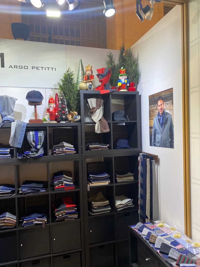 Clothes and holiday decorations on display at Margo Petitti, a luxury accessory company.