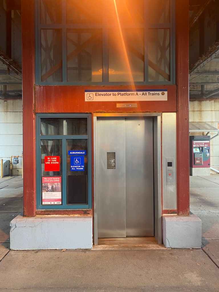 Elevator at Auburndale LIRR station that takes riders from street level to the platform.