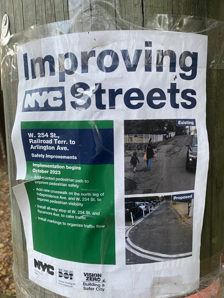 In what has been a long time coming, the NYCDOT has added a painted pedestrian path to W 254th St. This painted path essentially works like a standard bike lane. However, it is larger and has two solid and bright white lines, making it easily visible for motorists and pedestrians. Data from the Federal Highway Administration(FHWA) shows that separated pedestrian walkways of any kind can help reduce “‘walking along roadway crashes’” by 88%. As these types of crashes account for 8% of all roadway deaths in the U.S annually, the painted path is critical for the safety and comfort of all road users.