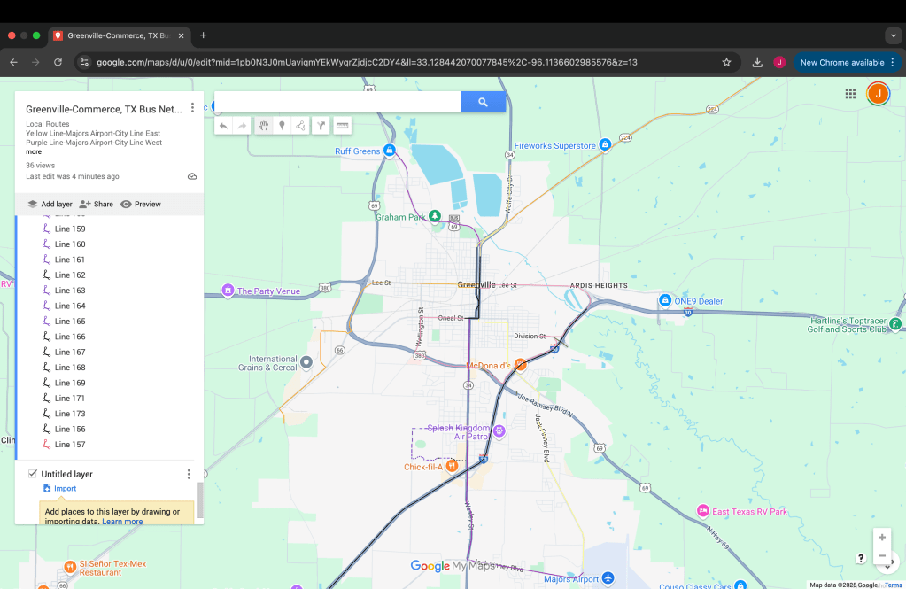 To address these issues, the city of Greenville can adopt a new, small fixed-route transit system. Service could be run with the larger mini buses used in places with lower population density such as in New York’s Finger Lakes Region and in East Chicago, Indiana. The bus system would consist of four local routes that cover almost the entirety of the city. Each route connects to the city’s downtown and provides access to different neighborhoods and destinations of interest. Two routes begin at Major’s Airport, which is a city-owned airport on the southeastern side of the city. This decision was made since the airport is a significant job hub and was a natural starting point for the two routes that both travel to the airport’s north. There is also a route that travels northeast through the city before running continuing to the city of Commerce. Commerce is another significant city in Hunt County and is home to East Texas A&M University.