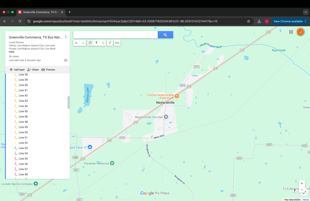 The Orange Line would run from the industrial strip on Hwy 66 and run through Downtown Greenville connecting to Commerce, TX via TX-224. The route would also include stops at the Laredo Sports Complex and in the City of Neylandville on TX-224. While Neylandville has a population of just 74 and no major destinations, the city’s location directly along the route provides the opportunity for a stop that will be within walking distance of all residents. Routing in Commerce will serve almost all significant destinations in that city including East Texas A&M University.