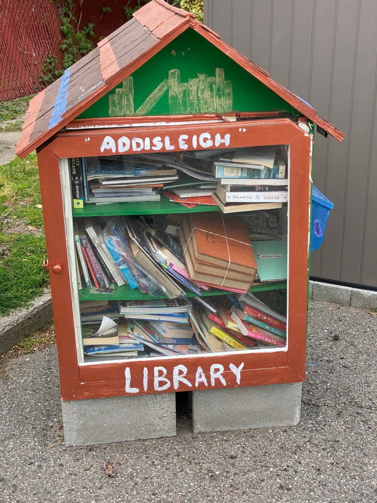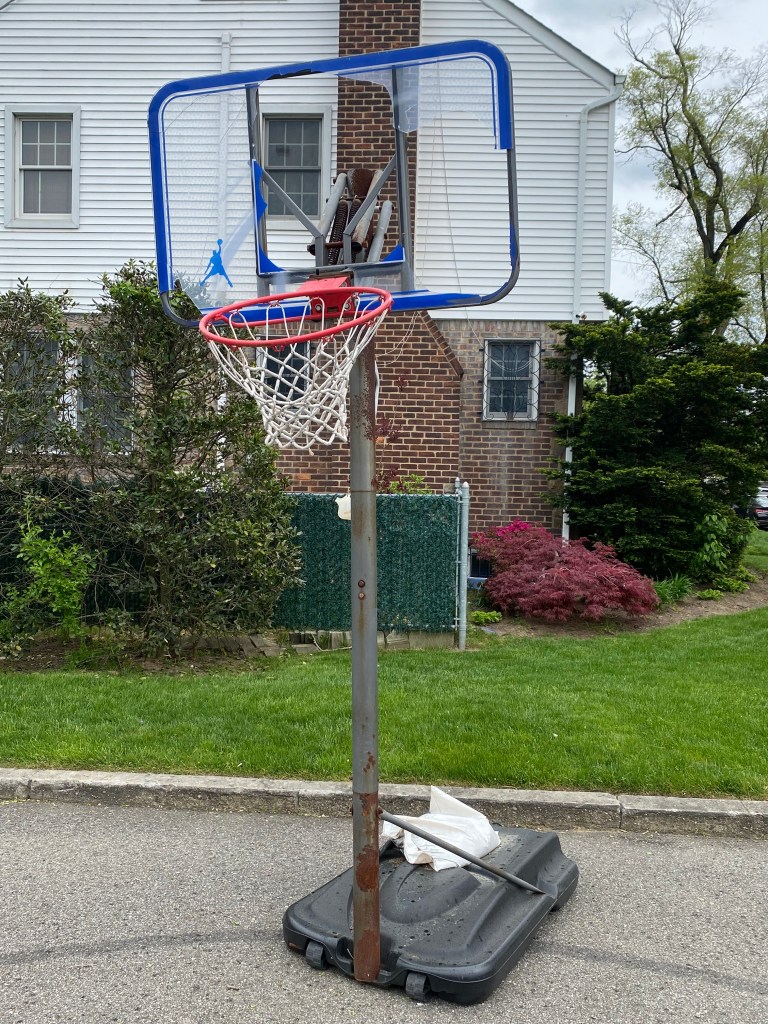 Basketball hoop at Murdock Ave Open Street with no backboard.Basketball hoop with broken backboard and bent rim at Murdock Ave Open Street.Chairs attached to string at Murdock Ave Open Street.Mini-Library at Murdock Ave Open Street.